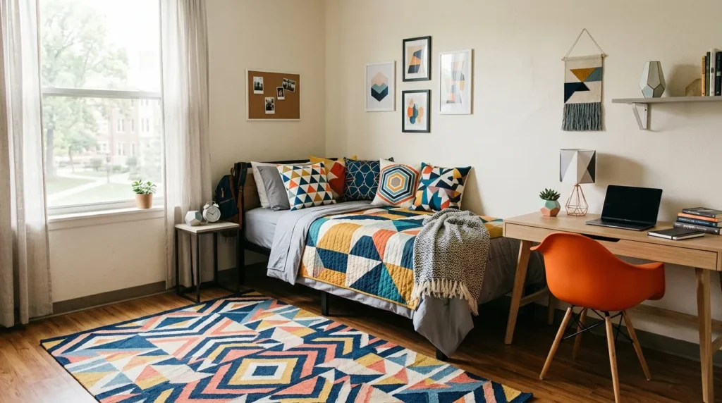 Geometric patterns are a smart way to make your dorm room stand out while still keeping the design clean. Whether you use them on bedding, rugs, throw pillows, or wall art, these shapes create strong visual appeal without making the room feel crowded. In small dorm spaces, that matters a lot. You want personality, but you do not want chaos.