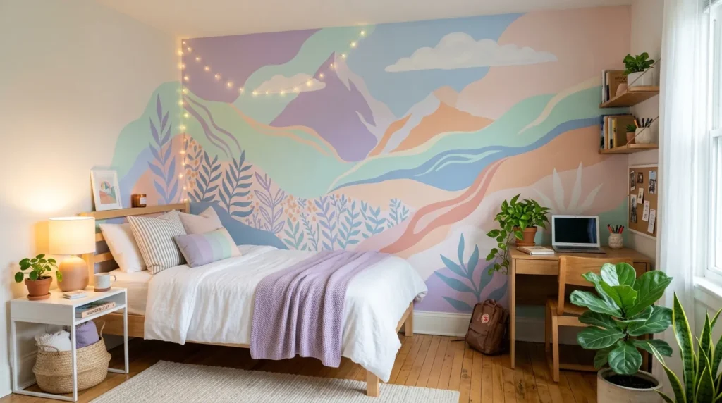 A mural can completely transform a basic dorm wall into something unforgettable. Whether it is painted, printed, or created with removable wall art, a strong visual backdrop instantly gives the room more identity. It helps the room feel styled with very little extra effort.