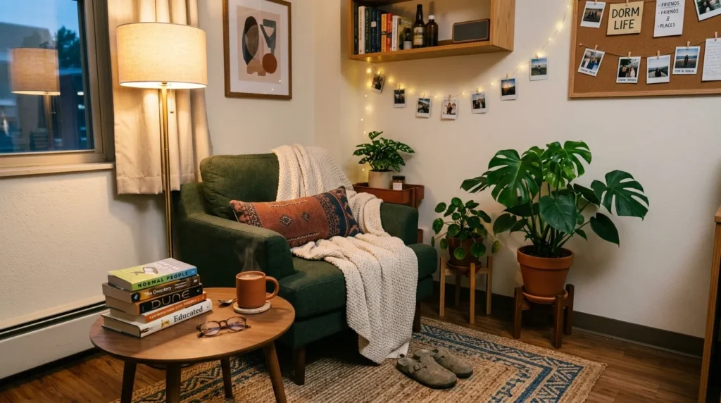 A cozy corner lounge gives your dorm room another layer of comfort. Instead of using only your bed or desk, you create a separate little zone where you can relax, read, chat, or simply take a break. Even one chair, a small table, and a soft lamp can make the room feel much more complete.