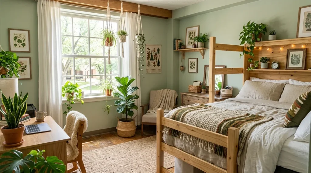 Nature-inspired décor can make a dorm room feel softer and more relaxing almost instantly. Wood tones, earthy shades, and simple greenery bring warmth to spaces that would otherwise feel plain or sterile. Even a few small plants can make a real difference.