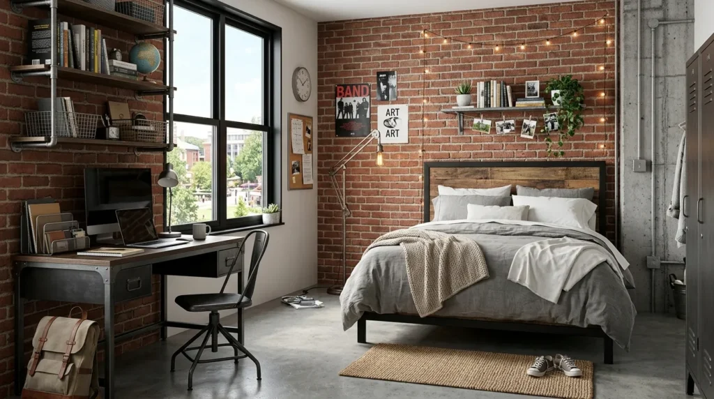Even if your dorm does not have exposed brick, you can still capture the feeling with industrial-style lamps, shelving, or furniture. The key is to keep the look clean and structured so the raw materials feel intentional rather than heavy.