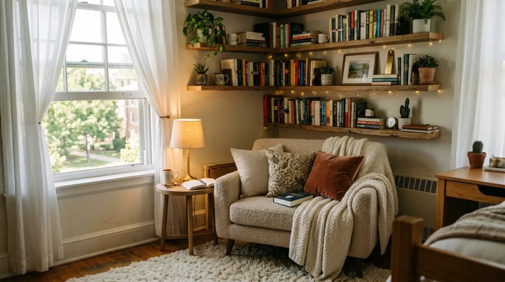 A reading nook can turn one forgotten corner of your dorm into your favorite place to relax. With a comfortable chair, a soft throw, and warm lighting, you can create a space that feels peaceful after a long day of classes. It adds charm without taking up much room.