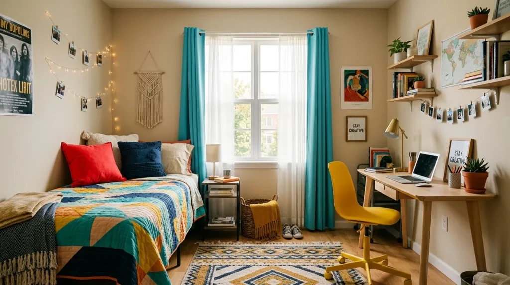 Bold color pops can instantly wake up a dorm room and make it feel far more exciting. When the base of the room stays neutral, bright accents like pillows, curtains, or a colorful chair help the space feel lively without becoming messy. This is an easy way to show personality while still keeping the room balanced.