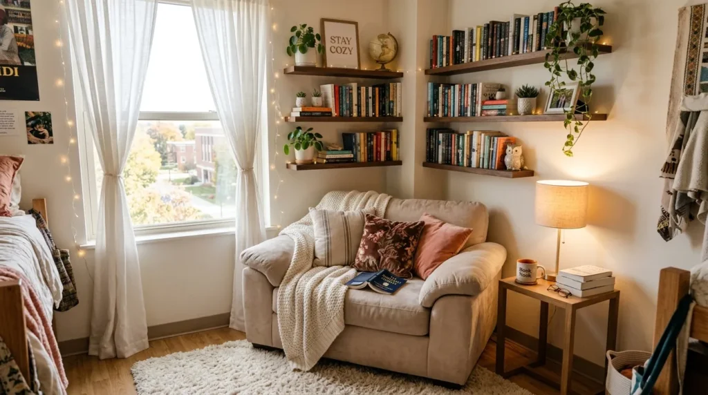 A cozy corner lounge adds another layer of comfort to your dorm by giving you a place to sit that is not just your bed or desk. A soft chair, a throw blanket, and a little table can completely shift the mood of the room and make it feel more like home.