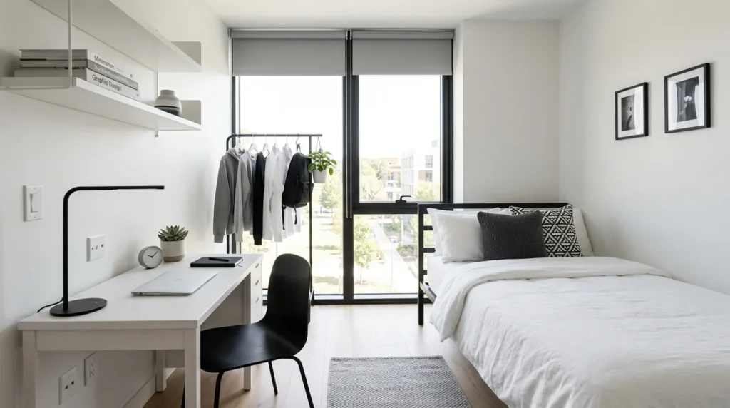Minimalist modern design is a strong choice if you want your dorm to feel open, airy, and calm. Neutral colors, simple furniture, and uncluttered surfaces create a fresh look that feels easy to live in. This style is especially useful in dorm rooms where space is already limited.