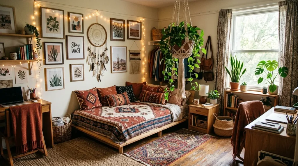 A bohemian-inspired dorm room filled with earthy tones like warm terracotta, rust, and soft browns. A low platform bed is dressed with a tapestry-style blanket and decorative throw pillows with bold, geometric patterns. The room has woven rugs on the floor and a large hanging macramé plant holder filled with lush greenery. Soft lighting comes from fairy lights strung around the room, creating a relaxed, cozy atmosphere. The walls are adorned with eclectic art pieces, dreamcatchers, and framed prints, giving the space a carefree, artistic feel.