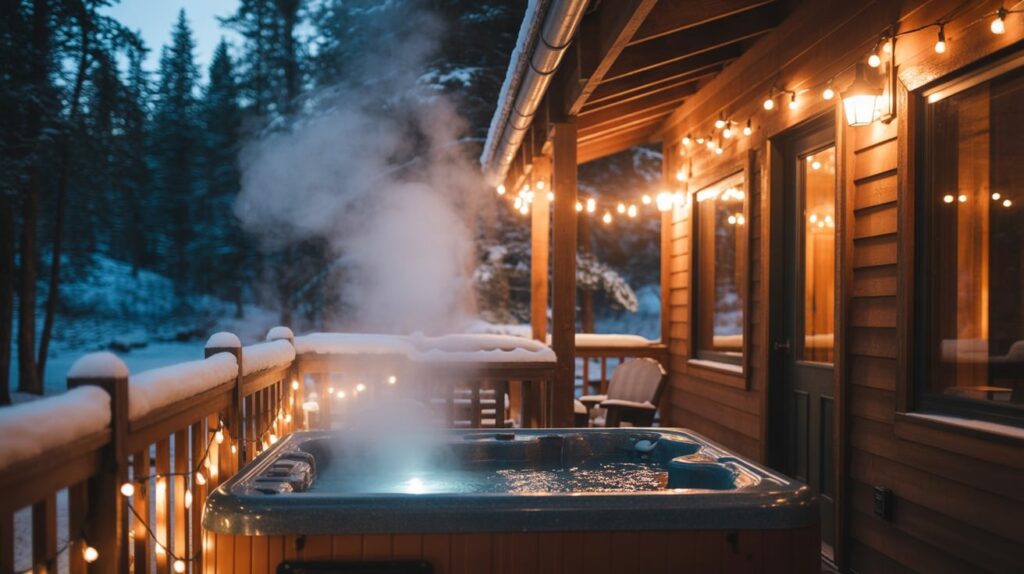 A private hot tub turns a snowy weekend into a full-body reset. Look for a cabin where the tub is close to the door so it’s easy to step out, soak, and return to warmth. The best setup includes a fireplace inside, a covered deck, and soft lighting so the outdoor space feels safe and calm after dark. With snow falling, the tub becomes the main activity without needing a packed itinerary.