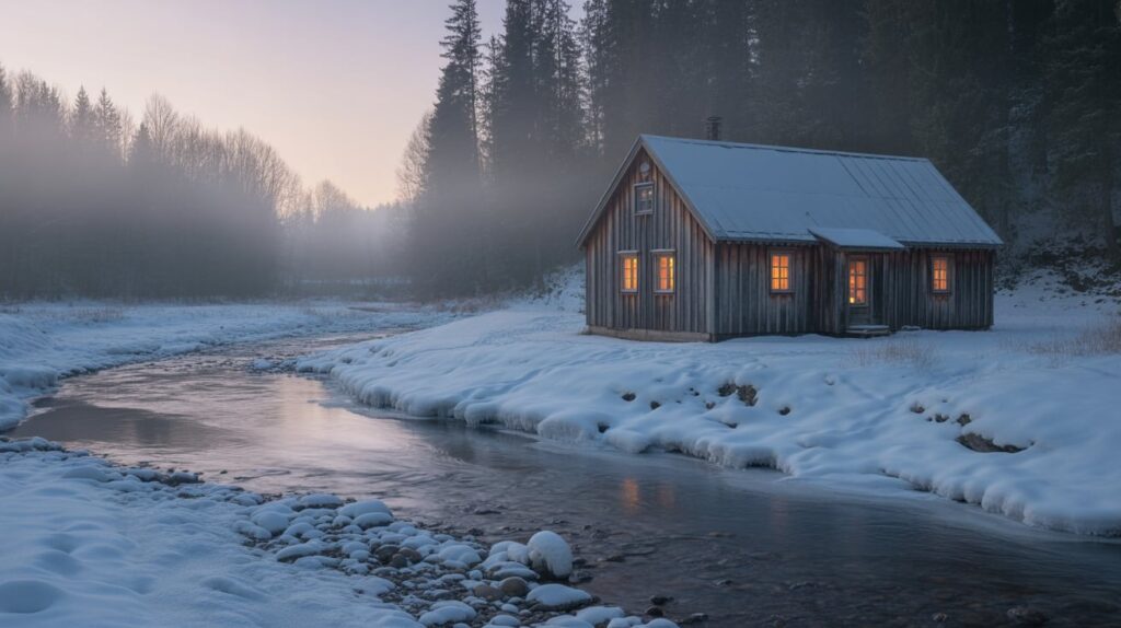 7) Riverside Cabin Beside a Partially Frozen Stream