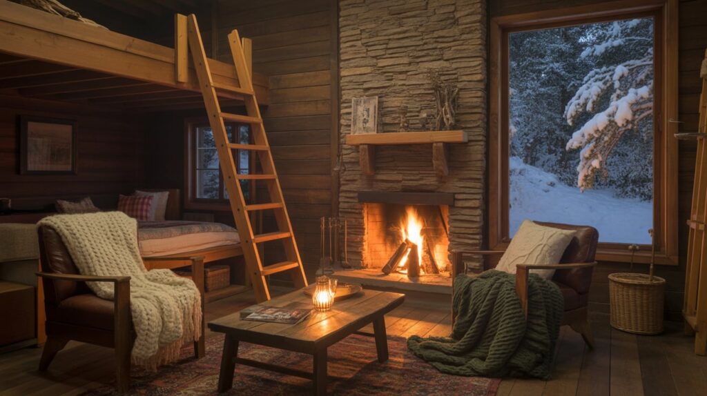 A loft cabin feels playful and cozy, especially when the fireplace sits below the sleeping space. It creates a natural weekend rhythm: warm evenings downstairs, then a snug sleep tucked under the roofline. Choose a cabin with soft lighting and a window that shows snow from the living area, so you get that winter mood even while cooking or playing games. The loft adds charm without needing a big footprint.