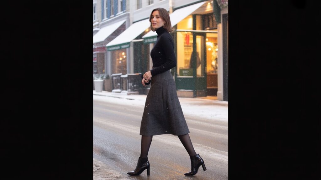 This is the “cute but warm” après dinner outfit that photographs beautifully. Pair a fitted black turtleneck with a wool midi skirt and opaque tights. Add heeled boots with a stable sole so walking on snowy sidewalks feels secure. The silhouette looks polished for nicer restaurants while still being practical in winter conditions. Breckenridge evenings run cold, so tights plus a wool skirt help keep warmth without bulky layers. (Breckenridge, Colorado) Top it with a long wool coat.