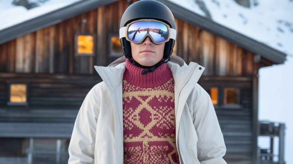 A retro sweater gives instant mountain personality, especially for lodge photos. Wear a patterned wool or knit ski sweater over a thin base layer, then top it with a clean shell jacket for snow protection. This combo looks classic on the mountain and transitions easily into indoor après without changing your whole outfit. Breckenridge’s town-to-mountain flow makes layers useful because you move between cold sidewalks and warm restaurants quickly.Finish with straight-fit ski pants and a beanie that matches one sweater color.