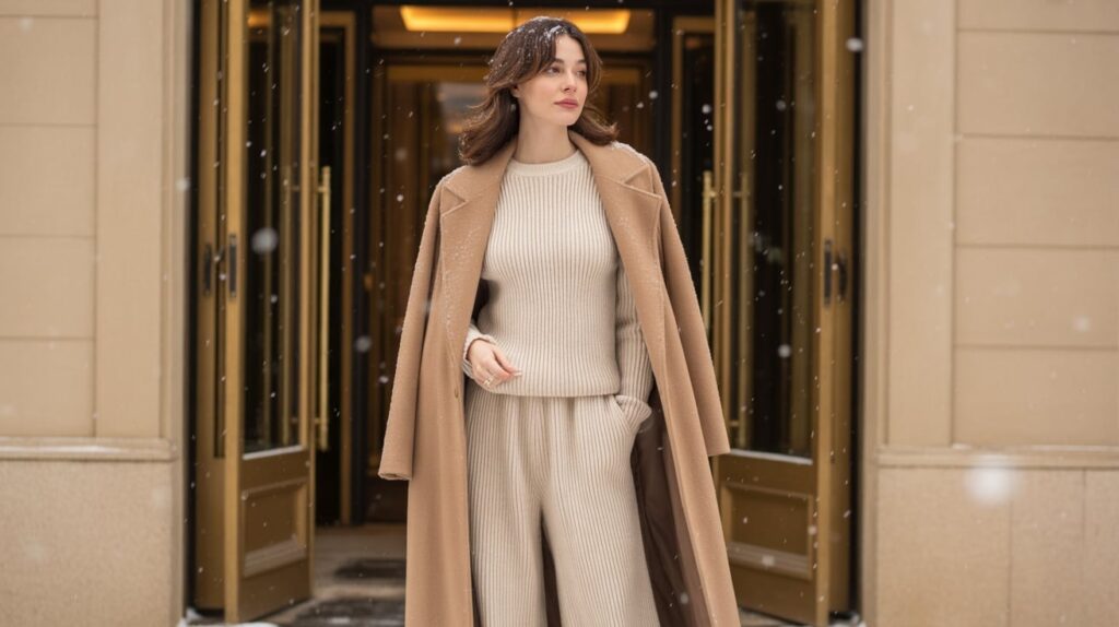 Choose a set in oatmeal, charcoal, or black for easy mixing. Add sleek boots and a small bag to keep the silhouette clean. If you want a little extra style, add a scarf in one accent color. The best part is repeatability: one set can carry two different nights by swapping coats or accessories. It packs well, looks expensive, and feels like you planned your outfit even when you’re tired and hungry.