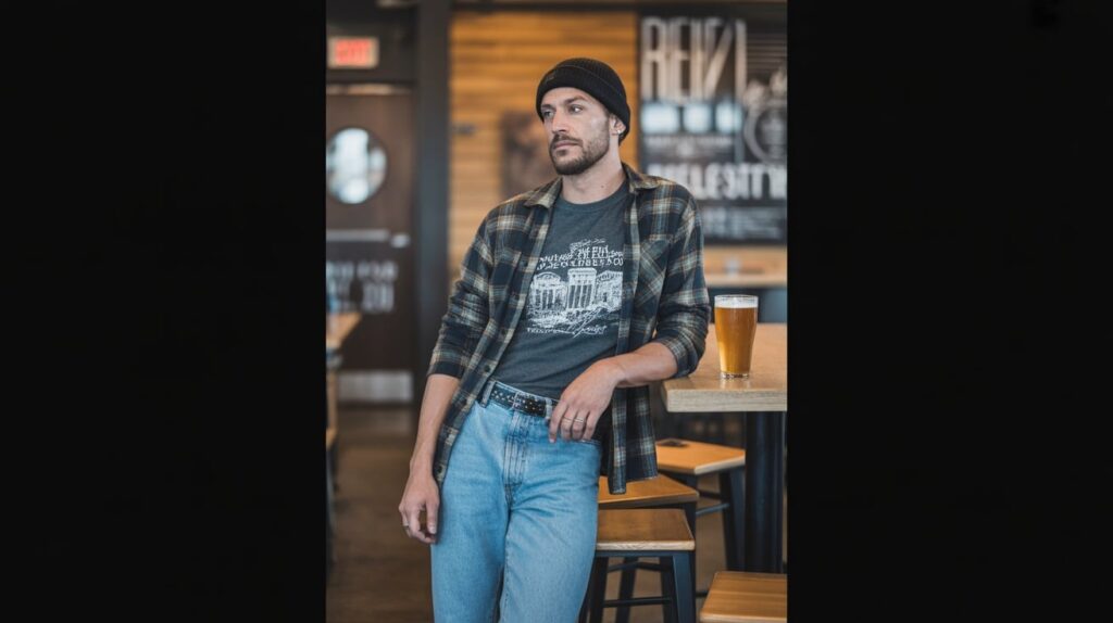 15) Brewery Night: Graphic Tee + Flannel + Straight Jeans + Beanie