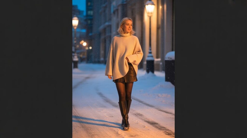 Keep colors simple: black tights, black boots, cream sweater, and a charcoal or plaid skirt. If you prefer more coverage, swap the mini for a knit midi skirt and keep the same sweater. This outfit works for dessert runs, live music, or a cozy bar. It feels like après style, but it still respects winter reality. Great for photos, great for comfort, and easy to pack.