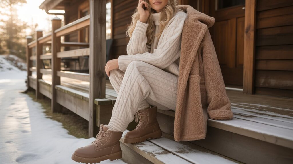 7) Cozy Cabin Day: Knit Set + Teddy Coat + Lug-Sole Boots