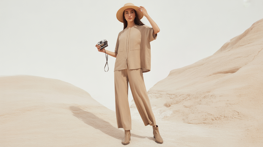 A matching set makes you look instantly curated—exactly the vibe Pinterest loves. Choose linen or lightweight cotton in oatmeal, beige, or light olive, with a relaxed top and elastic-waist pants. It packs easily, resists wrinkles better than you’d expect, and gives you two pieces you can remix later. Plus, it looks amazing in photos against dusty roads and sunset skies.