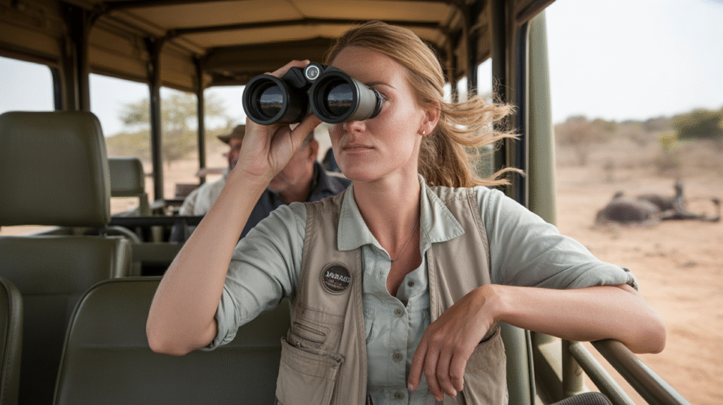 Balance the look with practical details: ankle boots or sturdy sneakers, longer socks for dust, and a lightweight windbreaker tucked into your bag. Keep jewelry minimal so it doesn’t snag, and bring a soft scarf to wipe dust off sunglasses. This combo works well for lodge brunch and short bush walks.