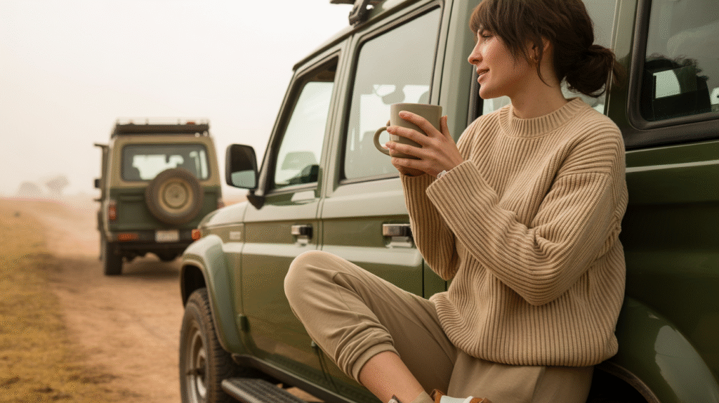 Evenings on safari can be cooler than expected, especially around campfires. A camel sweater with darker khaki pants feels cozy, timeless, and still “styled.” Add a soft scarf and a lightweight jacket if needed, and keep shoes closed-toe for comfort around camp areas. The warm tones look beautiful in low light and match the glow of lanterns and firelight.