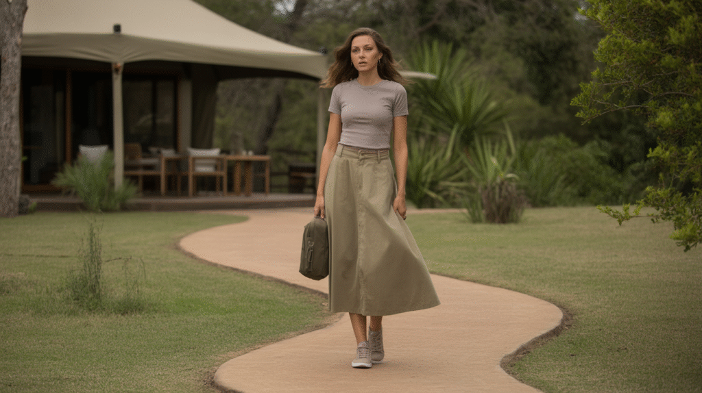 9) Neutral Midi Skirt + Fitted Tee (Fem-Forward Safari Styling)