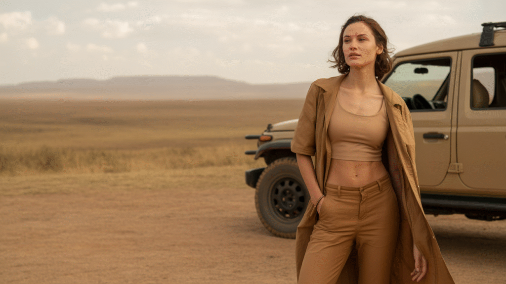 A monochrome neutral outfit is the easiest way to look expensive and intentional on safari. Pick one tone—tan, khaki, or soft olive—and match your top and bottom closely. The result is clean, flattering, and super photogenic against natural landscapes. It also keeps your suitcase simple because everything mixes and matches without clashing.