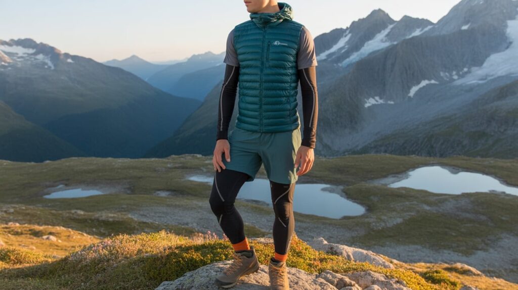 This is the classic mountain layering formula because each piece does a job. The thermal keeps warmth close to your skin, the fleece traps heat, and the puffer blocks wind on exposed trail sections. Leggings make movement easy for climbs and photo stops without bulky fabric.