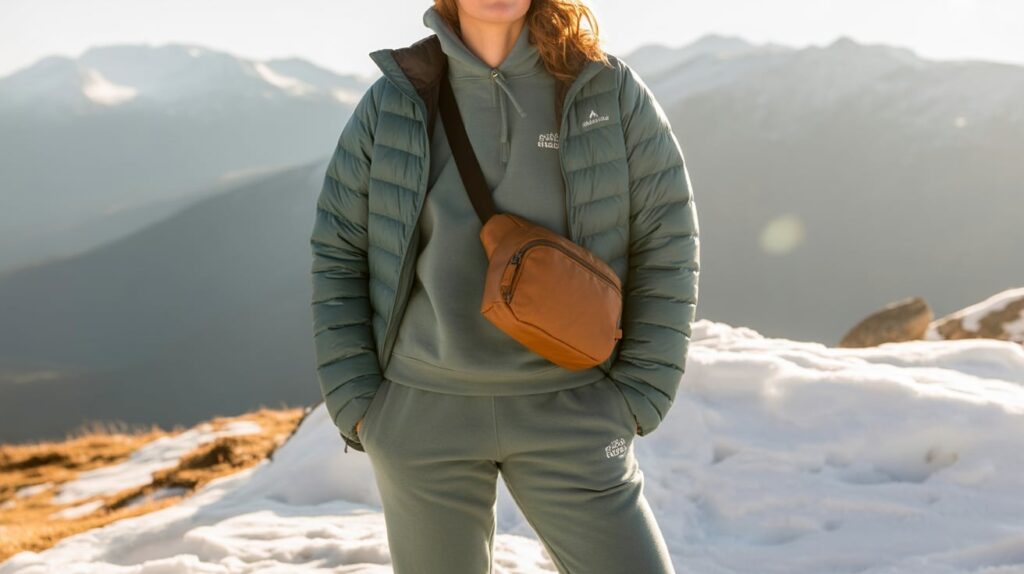 A matching sweatsuit is comfortable for travel days, cabin mornings, and casual trails. Add a packable down jacket for wind and cold at overlooks. A crossbody bag keeps essentials close and looks neat in photos, especially when you don’t want a backpack.