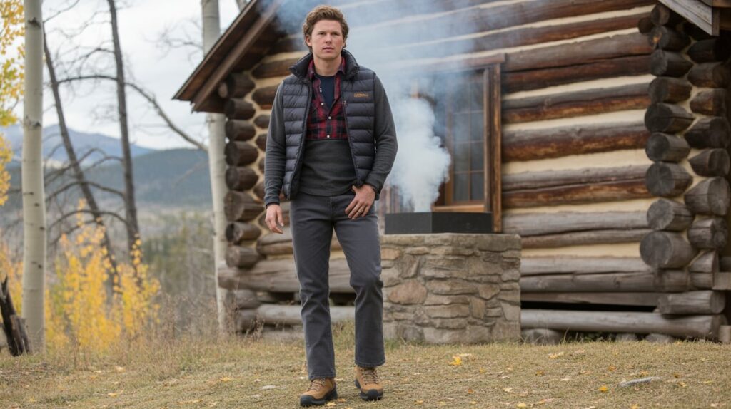 This outfit is perfect for town walks and easy trails where you want structure, not full athletic gear. The long-sleeve base gives warmth, the flannel adds texture, and a down vest keeps your core warm without restricting your arms. Jeans keep it classic for cafes and photos.