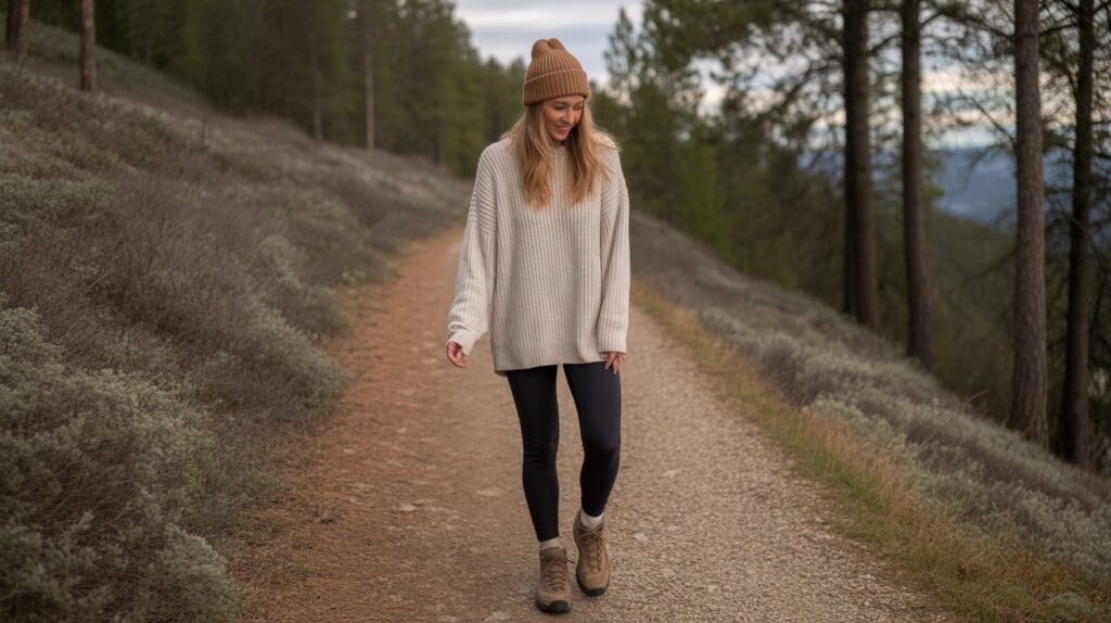 A knit sweater gives that cozy mountain vibe that looks perfect in cabin and trail photos. Pair it with thermal leggings so you stay warm without losing mobility. Hiking boots keep it trail-ready and make the outfit feel grounded and intentional.