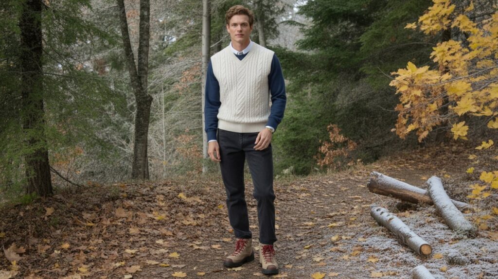 A sweater vest is a fun way to look styled while still staying warm. Layer it over a long-sleeve tee, then add jeans for structure and hiking boots for trail readiness. This is great for easy hikes where you want photos that look different from typical athletic outfits.