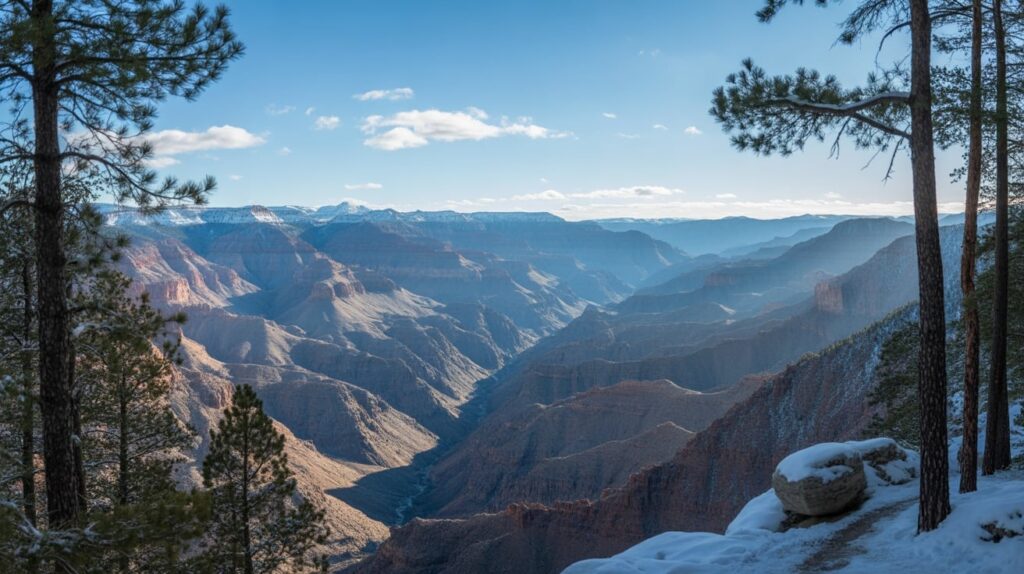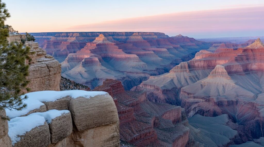 Grand Canyon winter photos look unreal when the rim is dusted with snow and the canyon layers glow underneath. Build your map around a handful of overlooks spaced through the day, so you can capture different light angles without rushing. Add one short, safe rim path walk for wide shots and a few close-ups of snow on stone. The contrast between bright rim foreground and shadowed canyon depth creates the kind of dramatic pin people save instantly.