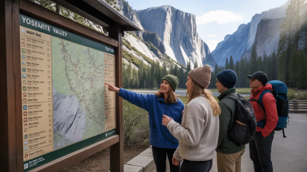 Start Day 1 with a “park once” mindset. Aim to enter early, grab a main lot spot near Yosemite Village, then switch to shuttles or walking for most of the day. It saves time, reduces stress, and keeps your itinerary photo-friendly because you’re not constantly circling for parking. Keep a small daypack ready with water, snacks, and layers so you can hop off the shuttle whenever a view looks good.