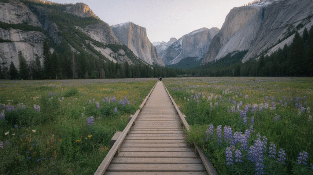 Walk with intention: pause often, frame shots with tall grass or boardwalk lines, and look for reflections after rain. This is also a great place to spot climbers on El Capitan if you bring binoculars or a zoom lens. Keep snacks handy and turn it into a mini picnic moment. The slower pace makes this stop feel luxurious, not “extra.”