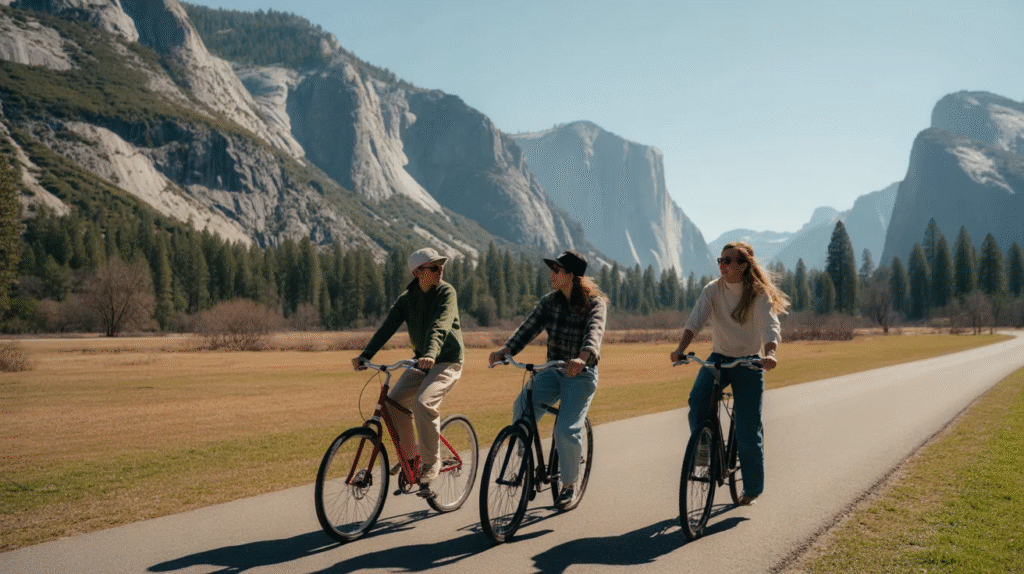 Biking the Valley is one of the easiest ways to feel like you “did a lot” without actually hiking hard. Pedal at a relaxed pace, stop whenever a meadow or river view calls you, and you’ll cover more ground than walking. It’s also a fun way to build a Day 1 afternoon that doesn’t feel crowded, because you’re always moving toward the next scenic moment.