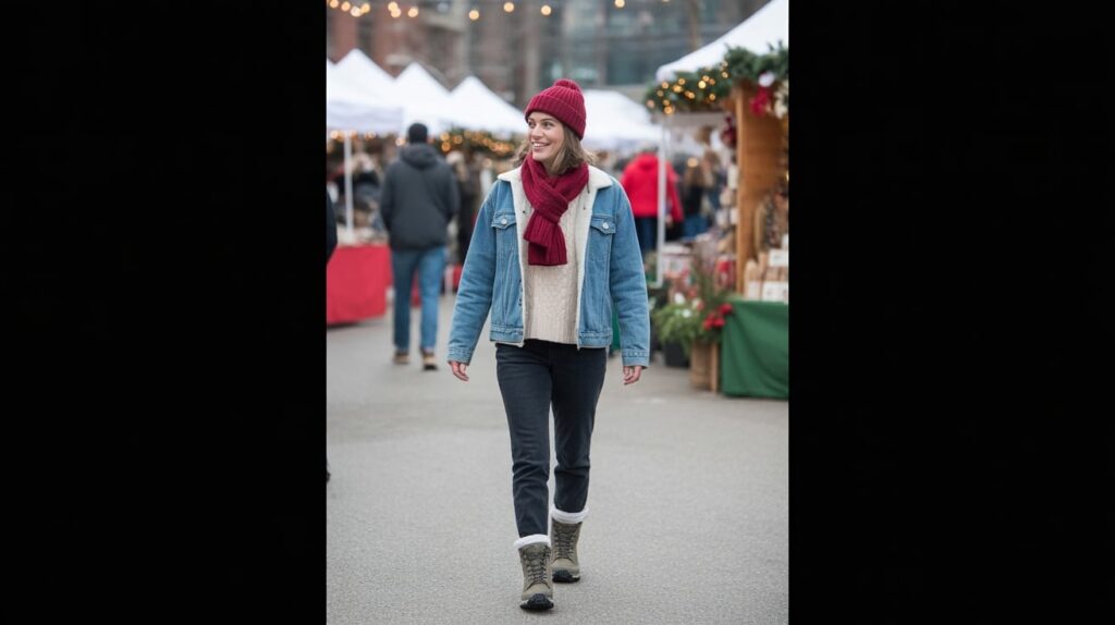 This outfit shines during daytime market browsing when temperatures change from sun to shade. The vest adds warmth to your core while the sweater gives texture that looks cozy in close-up shots. Choose boots with a rugged sole and a matte finish so they don’t look slick in photos. For a cute detail, clip a small holiday charm to your bag strap or wear a simple plaid scarf that echoes the festive storefront garlands.