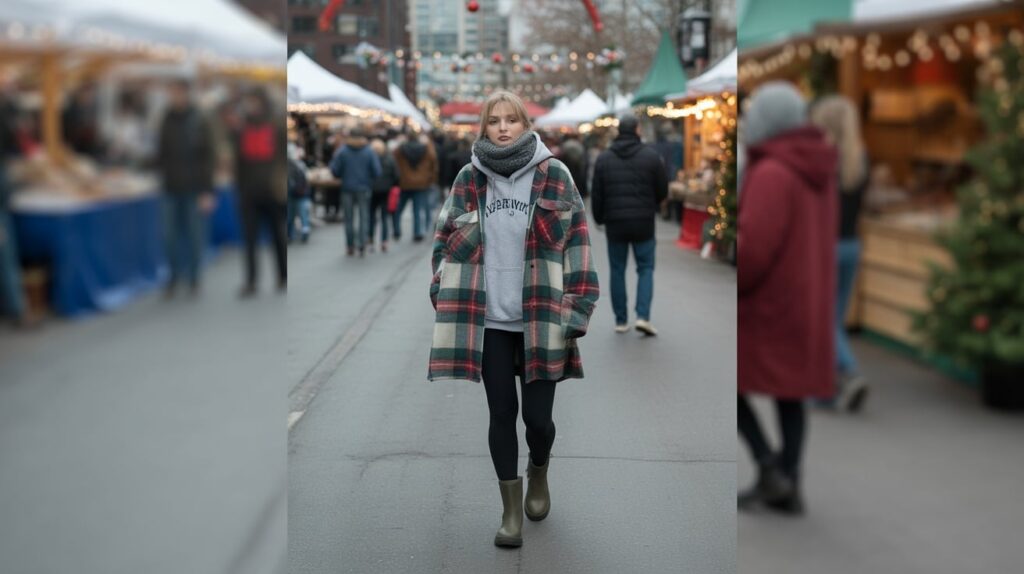 A plaid jacket gives a relaxed holiday style that fits Leavenworth’s casual, walkable vibe. Start with a thermal base and add a hoodie or crewneck sweatshirt for warmth, then top it with an oversized plaid jacket in red, green, or neutral tones. Pair with leggings or slim pants to keep proportions balanced. This outfit looks effortless and still photographs well, especially with a beanie and scarf that match one of the plaid colors.