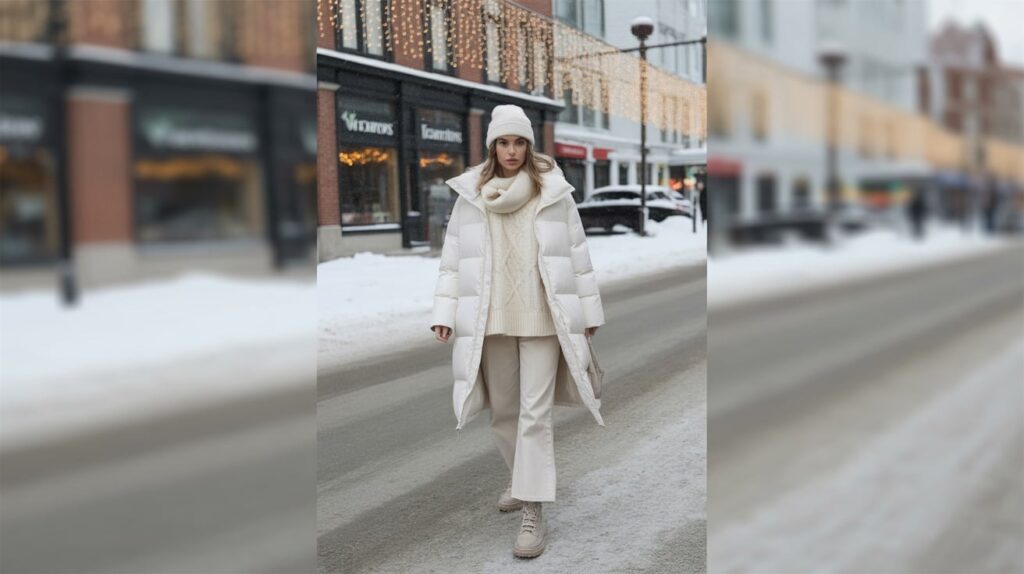 This outfit photographs best near darker storefronts, pine garlands, and warm lights that add contrast. Choose fabrics with texture—ribbed knits, wool, and quilted outerwear—so the all-white palette has depth. For market strolls, bring gloves and a crossbody in a soft neutral tone. If you want a small festive touch, add a red lip or a tiny red hair bow for one pop of color that still feels minimal.