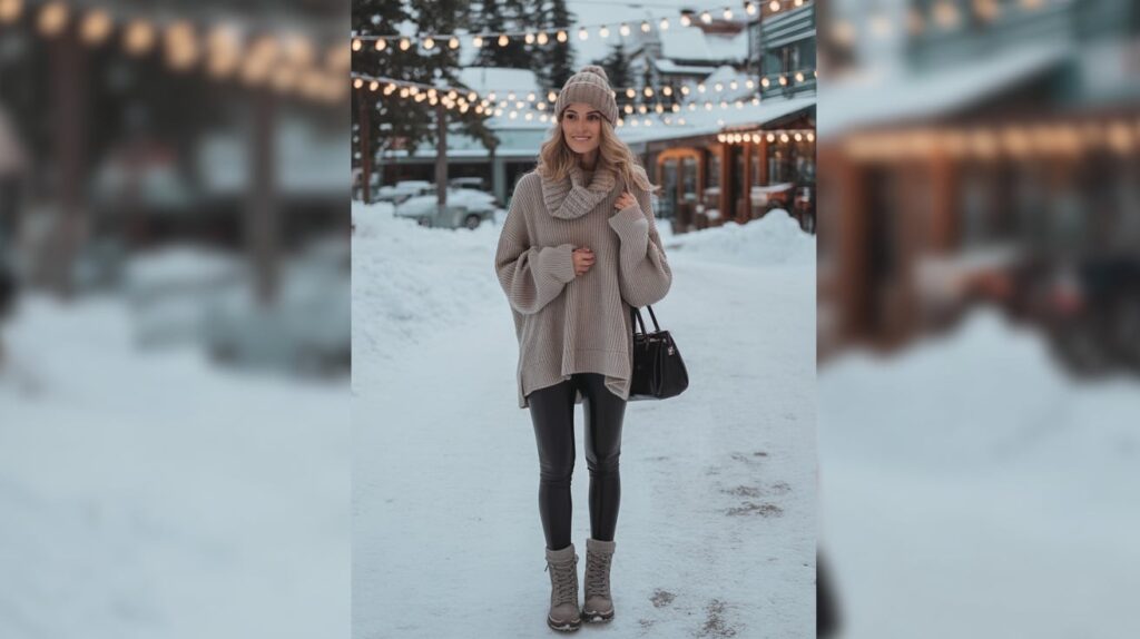 Leather-look leggings add a sleek contrast to cozy knits, making your outfit look styled even with minimal effort. Start with an oversized sweater in oatmeal, gray, or cream, then pair it with black leather-look leggings for shine and structure. Add a chunky scarf to balance the proportions and keep your neck warm. Finish with ankle snow boots and warm socks for comfort during market strolls and long photo walks through town.