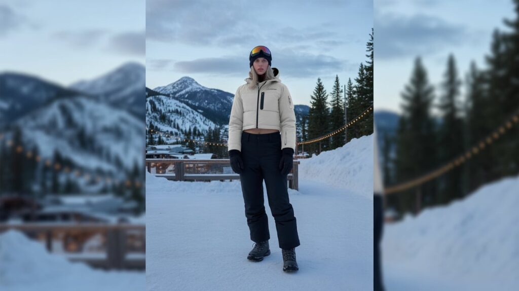 If you want a playful, mountain-ready look, ski bibs create instant winter energy. Choose insulated bibs in black, white, or tan and pair them with a cropped down jacket for a balanced silhouette. A ribbed beanie and warm gloves keep it practical, while goggles perched on top add a fun ski-chic detail for photos. This outfit feels perfect for snowy streets, sleigh-ride vibes, and playful shots in fresh snow.