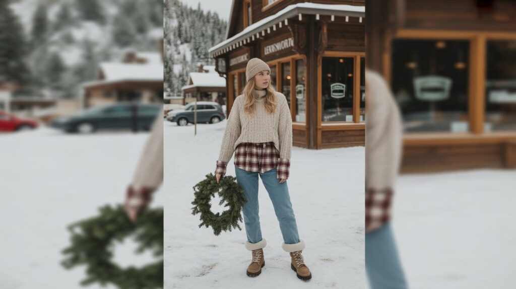Cabin-core outfits look perfect in Leavenworth because they match the town’s warm wood details and holiday décor. Start with flannel-lined jeans or thick denim and pair them with a chunky knit sweater in cream, rust, or evergreen. Add shearling-lined boots for warmth and texture, plus a beanie for a cozy finish. This outfit feels relaxed but still photo-ready, especially when you’re holding a wreath, pine sprigs, or a market pastry.