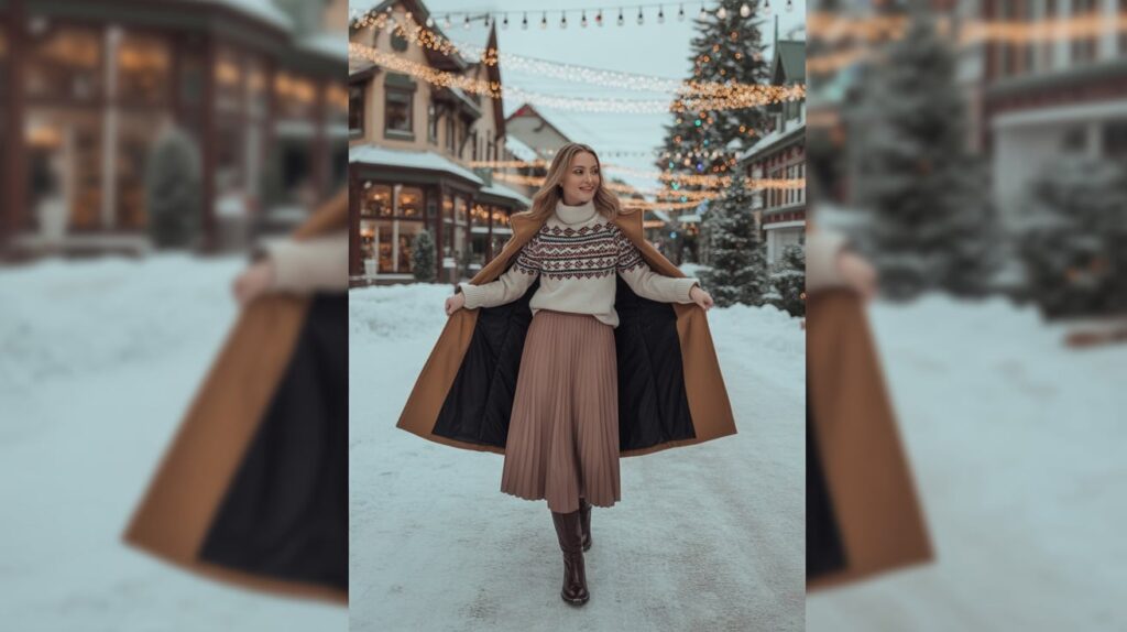 For warmth, wear fleece-lined tights under the skirt and keep your sweater slightly tucked in front to define the waist. In photos, stand under string lights or near decorated trees so the sweater pattern reads clearly. Add simple gold earrings or a hair clip for a small sparkle. A midi skirt moves beautifully in candid shots, especially when you walk through light snow, making the outfit look lively and romantic without feeling staged.