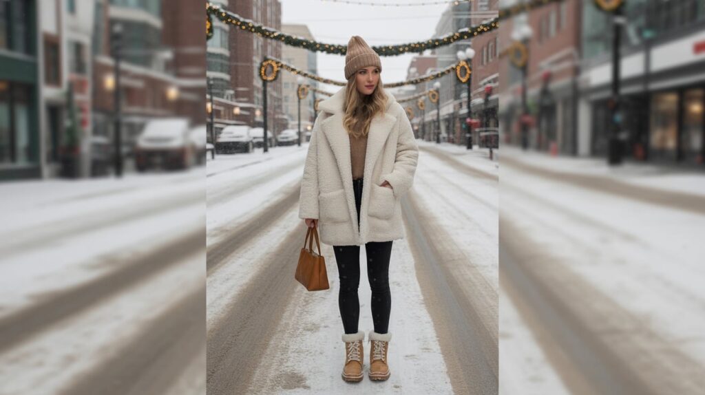A teddy coat creates that “warm hug” look that Pinterest loves, especially in a snowy town. Choose a cream or oatmeal teddy coat and pair it with black skinny jeans for contrast that photographs cleanly. Add a simple knit sweater underneath and keep accessories minimal so the coat stays the star. Shearling-style boots or insulated suede boots finish the cozy vibe, and they look perfect with snowy sidewalks and wood-trim storefronts.