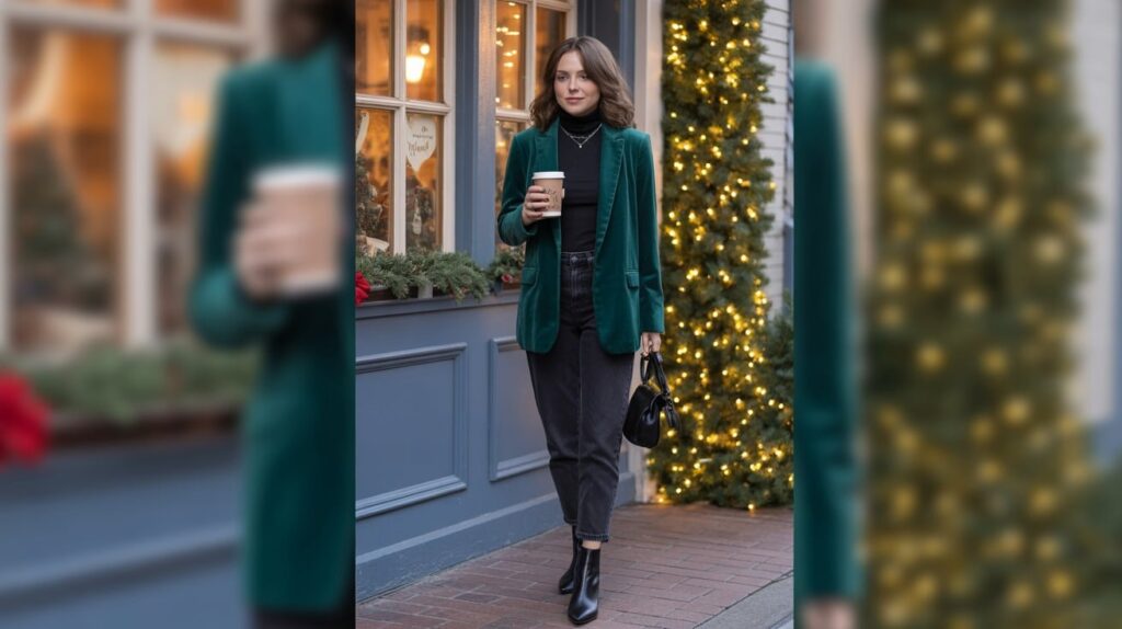 Velvet adds instant holiday polish, and emerald looks perfect against snow and warm string lights. Wear an emerald velvet blazer over a black turtleneck to keep the look sleek and flattering. Dark denim keeps it practical for walking, while ankle boots elevate the outfit without feeling overdressed. Add gold hoops or a simple chain necklace to catch the light subtly. This outfit fits dinner reservations, wine tasting, and evening photos near storefront displays.