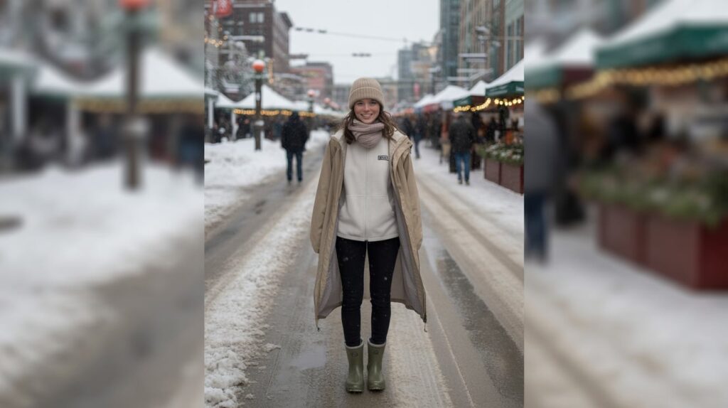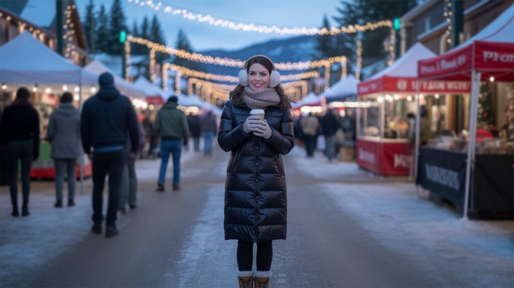 For strolling between stalls, comfort matters more than anything. Choose insulated boots with a waterproof exterior and enough room for thick socks. A puffer’s shine reflects holiday lights in a flattering way, especially at dusk. Hold a small paper cup or gingerbread for an easy prop, then angle toward lit windows so the glow hits your jacket and beanie. This outfit works for snow photos, shopping, and dinner without changing layers.