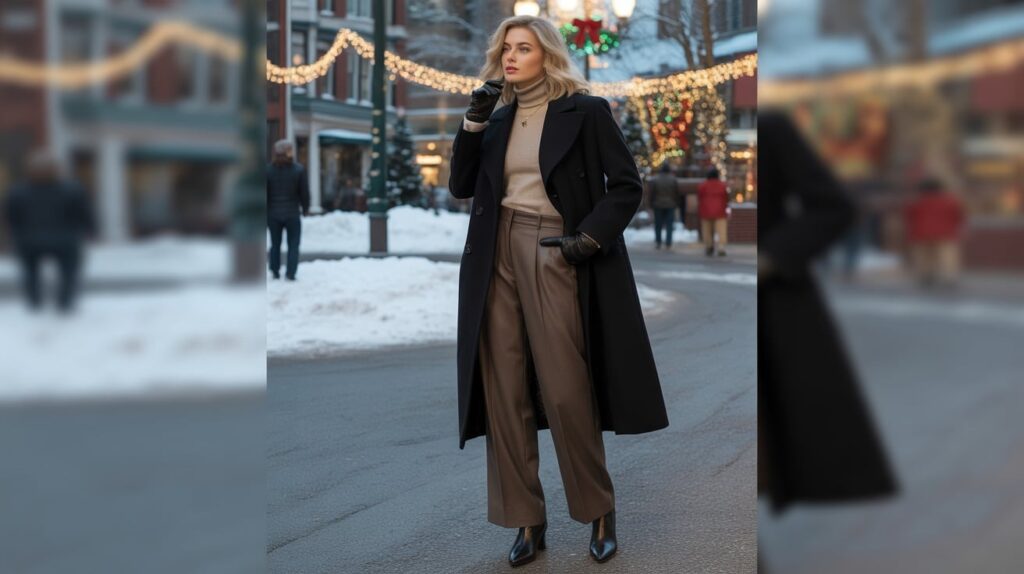 To keep it practical, choose trousers with enough room for warm tights or thin base layers underneath. A simple scarf in a neutral tone softens the look and adds warmth without distraction. For photos, stand near lampposts wrapped in garland so the tailored coat looks sharp against the holiday décor. This outfit works best for slower strolls, cozy cafés, and moments when you want your pictures to feel refined and timeless.