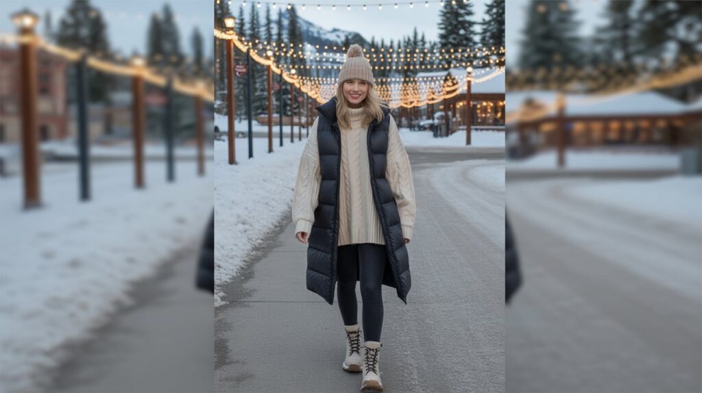 A long puffer vest makes layering easy while keeping your arms free for shopping bags and photo posing. Pair a chunky cable-knit sweater with a knee-length vest in black or charcoal for a polished contrast. Add warm leggings or slim pants to balance the volume on top. A knit beanie and matching gloves keep the look cohesive, and the vest’s vertical lines photograph well against Leavenworth’s busy holiday décor.