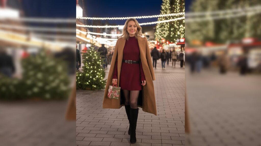 A sweater dress keeps things simple while looking instantly put-together. Choose a burgundy sweater dress for a rich holiday tone that flatters in golden string lights. Add black thermal tights and knee-high boots for warmth and a sleek line. Layer a belted coat over top to define your shape, and pick a scarf in cream or plaid for a festive accent. This outfit suits snowy photos, dinner reservations, and cozy cafés.