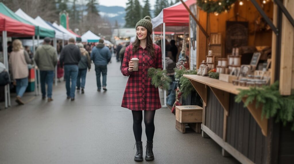 A flannel dress brings cabin energy that matches Leavenworth’s cozy holiday mood. Choose a red-and-black or green-toned flannel dress and pair it with thick black tights for warmth. Add combat boots for traction and a slightly edgy contrast that still feels winter-appropriate. Layer with a long cardigan or coat depending on temperature. This outfit looks great in photos near wood storefronts, wreaths, and string lights because the flannel reads instantly festive.