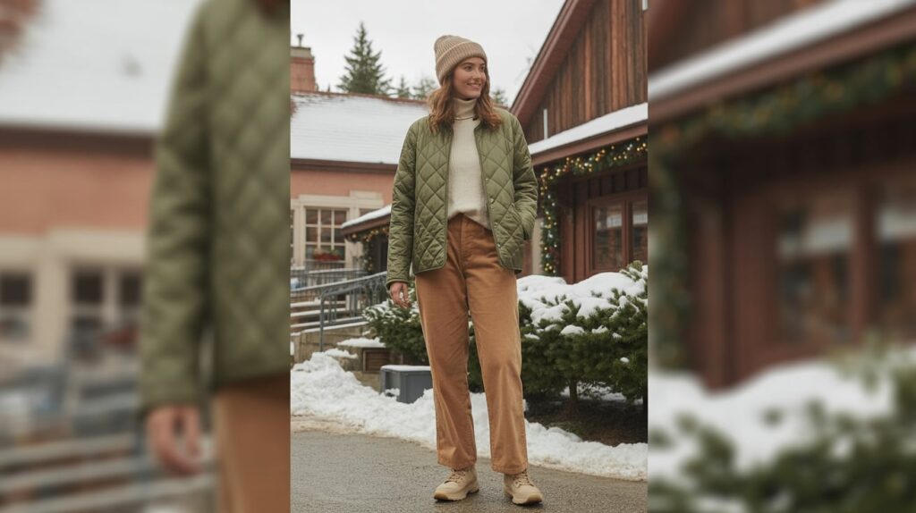 Quilted outerwear and corduroy create a warm, textured look that feels perfect for a Christmas town. Wear an olive or navy quilted jacket over a cream turtleneck, then add corduroy pants in tan or chocolate for a cozy winter palette. This combo looks rich in photos because the fabrics catch light differently. Finish with a knit beanie and waterproof boots so you can walk comfortably through snowy streets and market stalls.