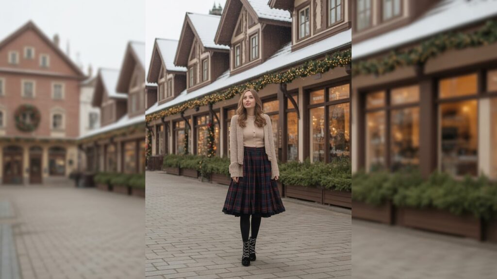 To stay warm, tuck a heat-friendly base layer under your top and choose tights that feel substantial, not thin. Bring a longer wool coat to throw on between photos, then open it for pictures to show the skirt and cardigan. This outfit looks especially good near wreaths, ornaments, and wood-trimmed storefronts. Hold a small bouquet of pine sprigs or a paper bag from a market stall for a candid, “mid-stroll” vibe.