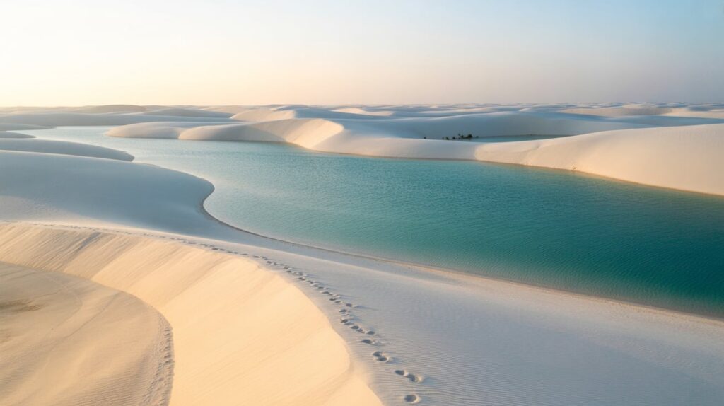 Map pin: Maranhão, northeastern Brazil. This landscape looks like a desert that forgot it’s supposed to be dry—white dunes filled with seasonal blue lagoons. The strongest photos come from height: shoot from a dune crest so the lagoon shapes read like abstract brushstrokes. Keep the horizon high or remove it entirely, so viewers focus on repeating curves and water pockets.